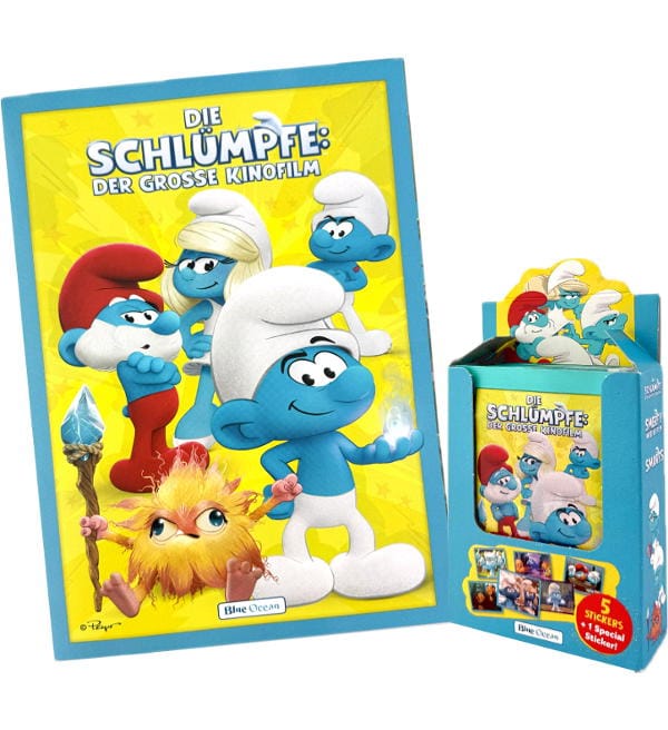 Album (version allemande) + boîte de 24 pochettes pour la collection de stickers "Blue Ocean Schtroumpfs Movie 2025". Chaque pochette contient 6 autocollants.