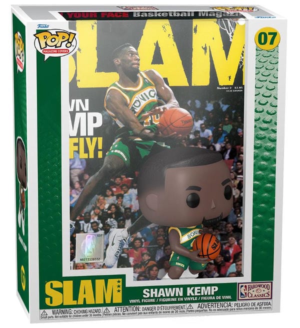 Funko POP! "Magazine Covers 07 - Shawn Kemp SLAM" comme Trading Card POP!. La figurine en vinyle mesure environ 9 cm de haut et est livrée dans une boîte à fenêtre.