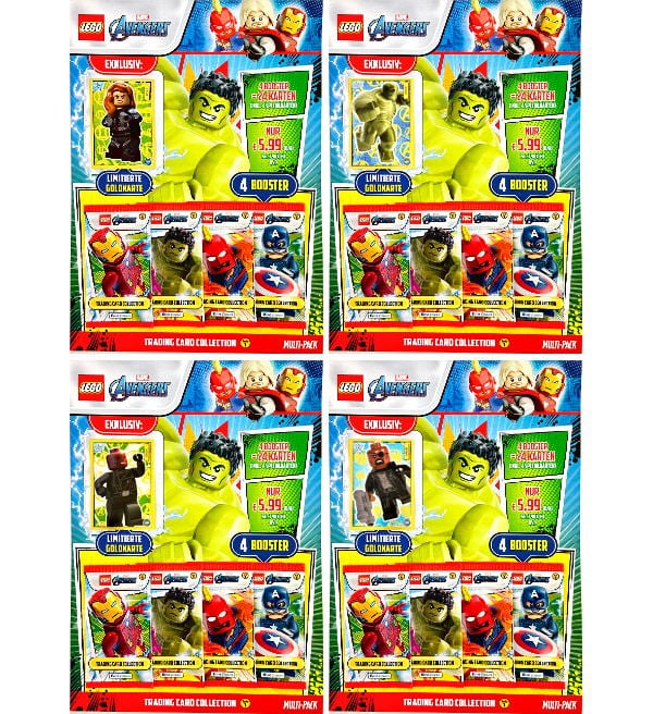 Tous les 4 Multipack de la collection Lego Avengers Serie 1 Trading Cards Collection. Cette offre vous apporte 16 pochettes (=96 cartes) + 4 cartes limitées différentes: