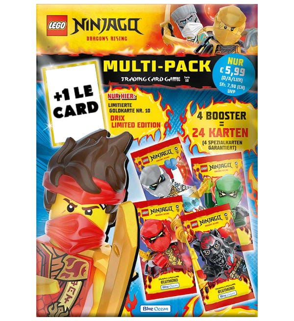 Lego Ninjago Serie 10 Blutmond Multipack avec 4 pochettes (=24 cartes) + 1 carte limitée. Chaque Multipack contient 1 de 4 Limited Cards suivants: