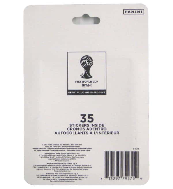 Blister avec 5 pochettes Panini Brasil 2014 collection de stickers, version Etats-Unis / Canada. Chaque pochette contient 7 stickers au lieu de 5. Il n'y a aucun code à barres et l'imprimée est horizontale. Ce blister contient 35 stickers au total.