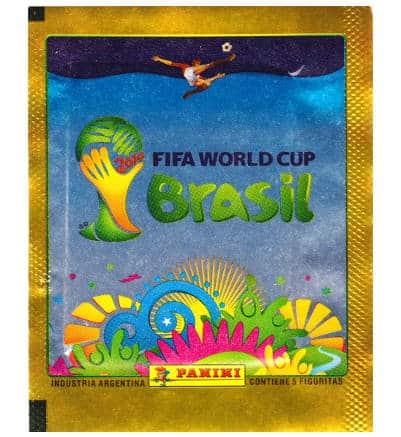 Pochette argentine Panini Coupe du monde 2014 avec bordure dorée. Cette version a été vendue exclusivement en Argentine et contient 5 autocollants.