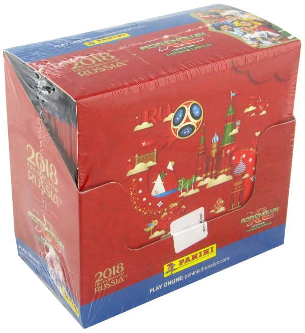 Boîte de 50 pochettes Panini Coupe du Monde 2018 Adrenalyn XL. Chaque pochette centient 6 cartes, cela fait un total de 300 cartes.