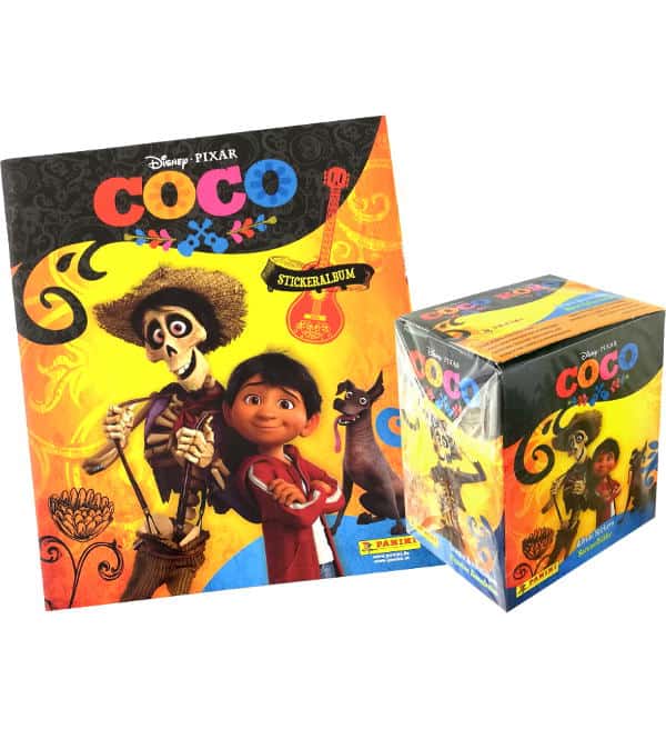 Album vide (version allemande) + Boîte de 36 pochettes pour la collection de stickers "Panini Disney Pixar Coco". Chaque pochette contient 5 autocollants.