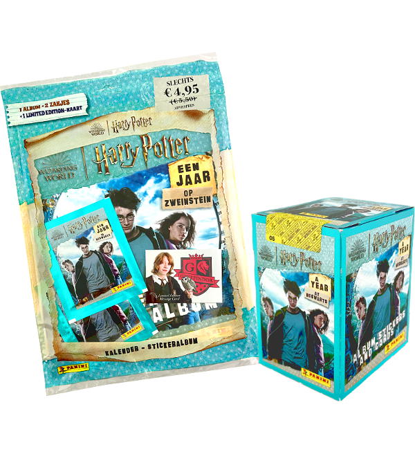 Starterset (version néerlandaise) + boîte de 36 pochettes pour la collection de stickers & cards "Panini Harry Potter A Year at Hogwarts". Chaque pochette contient 4 autocollants + 1 Trading Card.