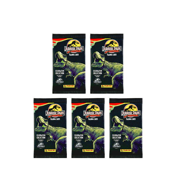 5 pochettes de la collection "Panini Jurassic 30th Anniversary" Trading Cards. Chaque pochette contient 6 cartes.