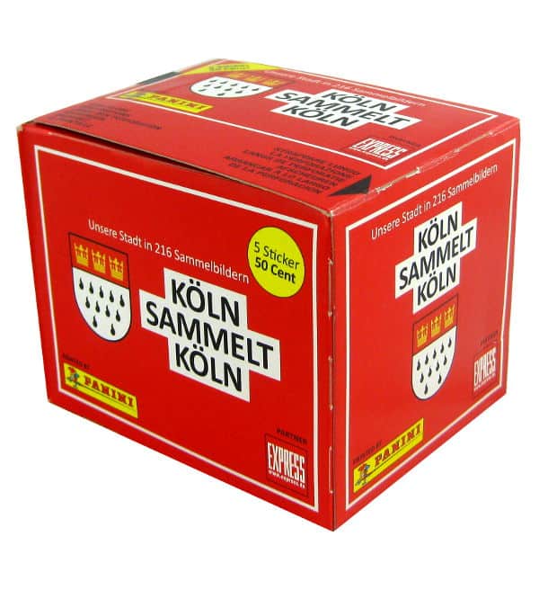 Boîte de 50 pochettes de la collection de stickers Panini Köln sammelt Köln. Chaque pochette contient 5 stickers, cela fait un total de 250 stickers.