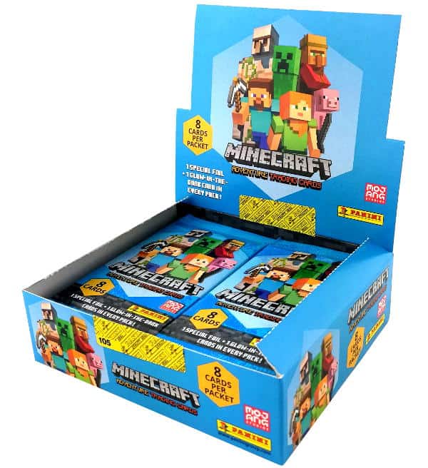 Boîte de 18 pochettes de la collection Panini Minecraft Trading Cards. Chaque pochette contient 8 cartes, cela fait un total de 144 cartes.