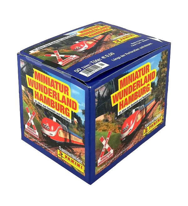 Boîte de 50 pochettes pour la collection de stickers "Panini Miniatur Wunderland Hamburg 2 (2011)". Chaque pochette contient 5 autocollants.