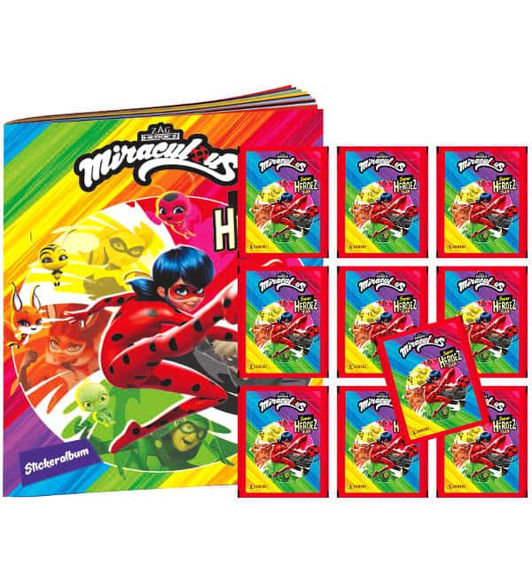 1 album + 10 pochettes pour la collection officielle de stickers et cartes Panini Miraculous "Super Heroez Team". Chaque pochette contient 4 autocollants + 1 carte.