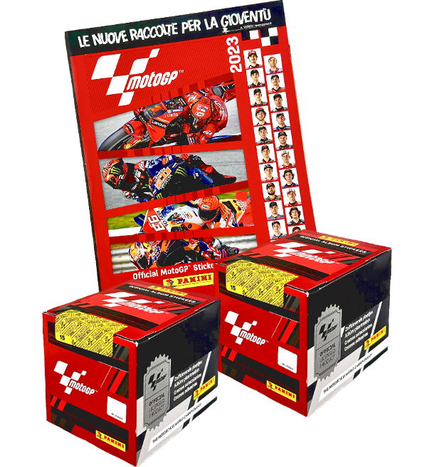 Album (version italienne) + 2 boîtes (=100 pochettes) pour la collection de stickers "Panini Moto GP 2023". Chaque pochette contient 5 autocollants.