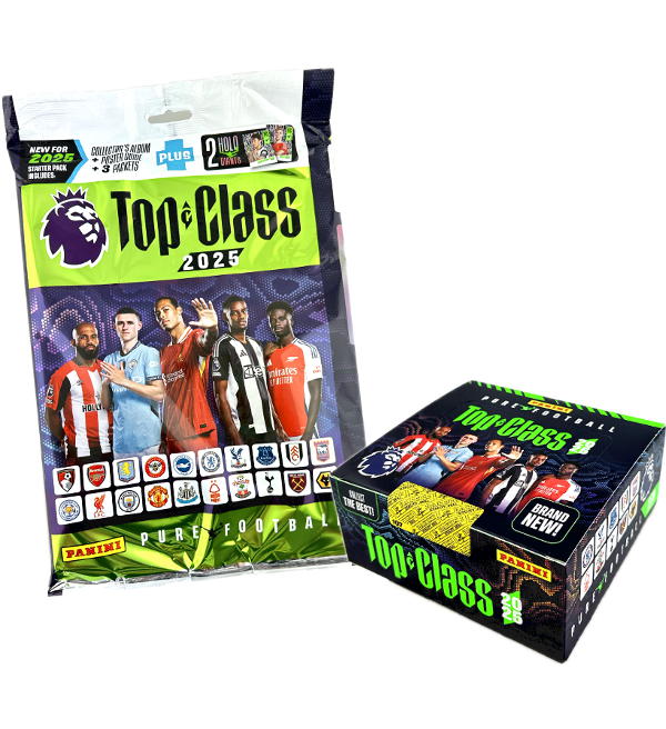 Starter Pack (3 Packs, 2 Holo Giants Cards, 1 Collector's Album) + 1 Boîte (=24 pochettes) de la collection "Panini Premier League Top Class 2025" Trading Cards. Chaque pochette contient 8 cartes.