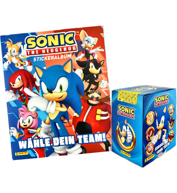 Album allemand + boîte de 36 pochettes pour la collection de stickers Panini Sonic the Hedgehog - Choose Your Team. Chaque pochette contient 5 images.