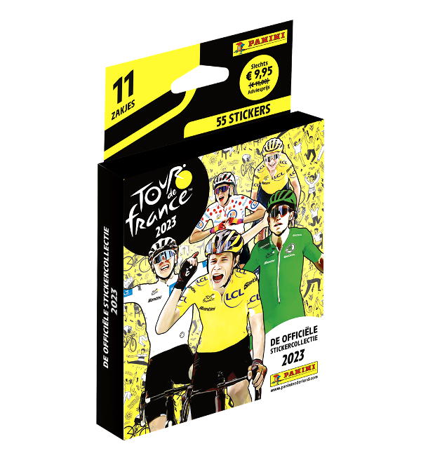 Eco-Blister de 11 pochettes pour la collection de stickers "Panini Tour de France 2023". Chaque pochette contient 5 autocollants.