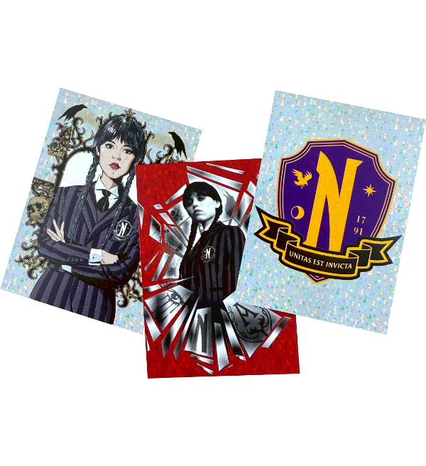 Boîte de 24 pochettes de la collection "Panini Wednesday Mystery" Trading Cards. Chaque pochette contient 6 cartes, cela fait un total de 144 cartes.