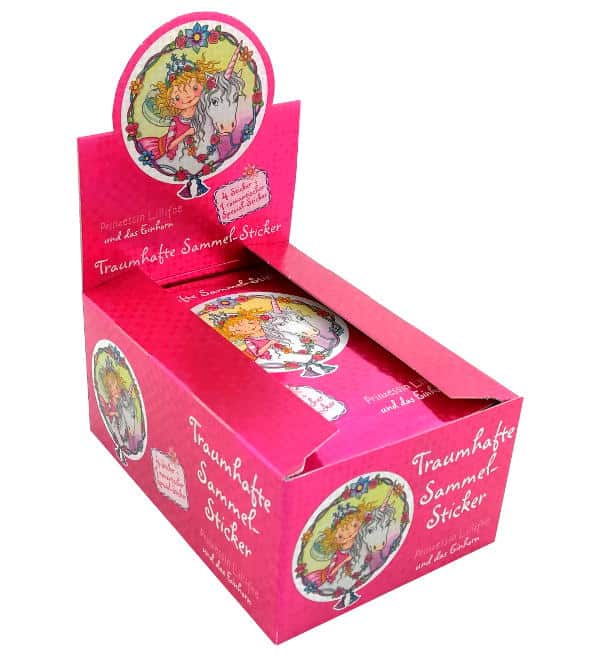 Boîte de 50 pochettes pour la collection de stickers "Prinzessin Lillifee und das Einhorn". Chaque pochette contient 5 autocollants.