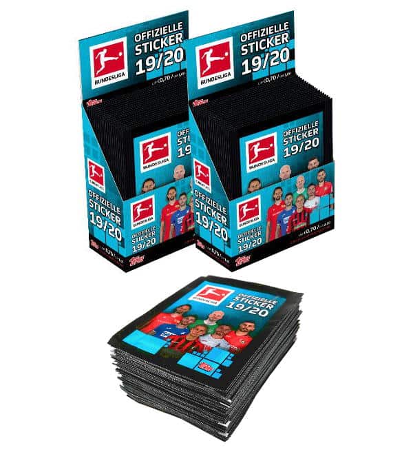 2 boîtes + 50 pochettes (=610 autocollants) de la collection de stickers Topps Bundesliga 2019/2020.