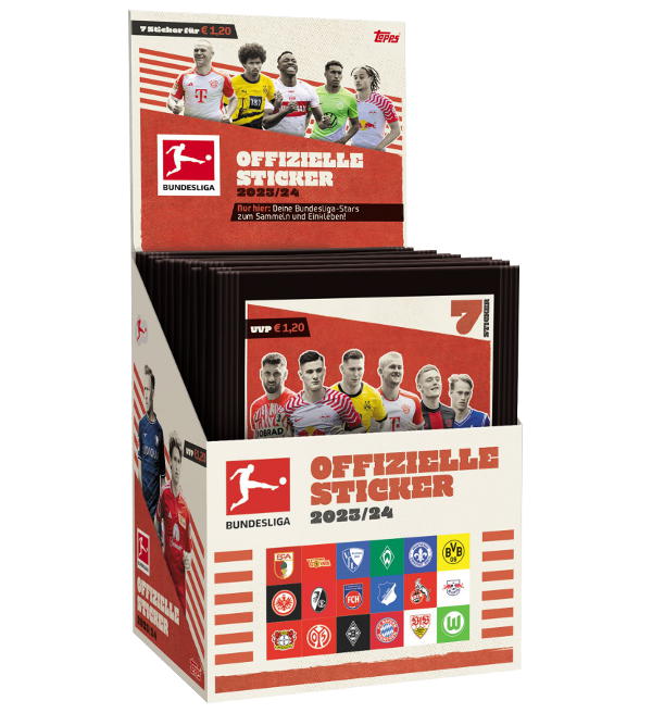 Boîte de 50 pochettes Topps Bundesliga 2023/2024. Chaque pochette contient 7 stickers.