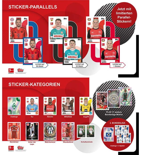 Album + 2 boîtes (=100 pochettes) Topps Bundesliga 2024/2025. Chaque pochette contient 7 stickers.