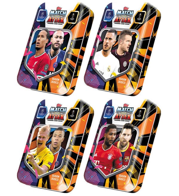 Tin Set avec 4 Mini Tins de la collection Topps Match Attax Champions League 2020/21 Trading Cards. Chaque Mini Tin content 44 cartes (38 Base, 6 Special) + 1 Limited Edition Card. Ces 4 motifs sont inclus: