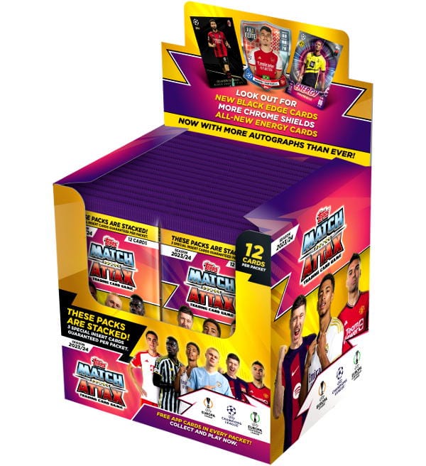 Boîte de 36 pochettes (=432 cards) de la collection Topps Champions League 2023/24 Match Attax. Chaque pochette contient 12 cartes.