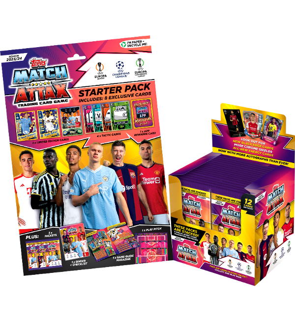 Starterpack + boîte de 36 pochettes de la collection Topps Champions League 2023/24 Match Attax avec: