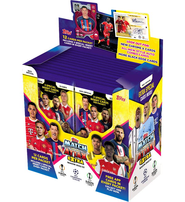 Boîte de 24 pochettes (=288 cards) de la collection Topps Champions League 2022/23 Match Attax EXTRA. Chaque pochette contient 12 cartes.