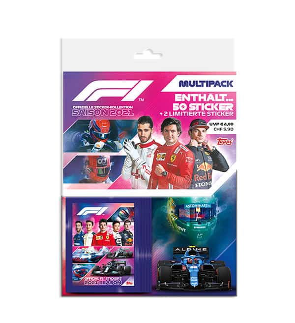 Multipack de 50 autocollants + 2 Limited stickers de la collection de stickers Topps Formula 1 F1 2021.