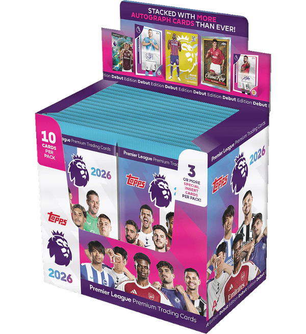 Boîte de 28 pochettes de la collection Topps Premier League 2026 Debut Edition Trading Cards avec: