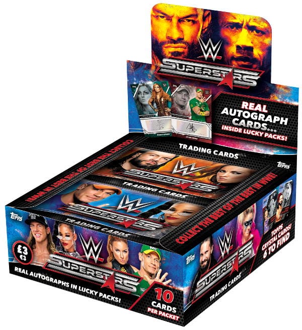Boîte de 20 pochettes de la collection "Topps WWE Superstars 2021". Chaque pochette contient 10 cartes, cela fait un total de 200 cards.