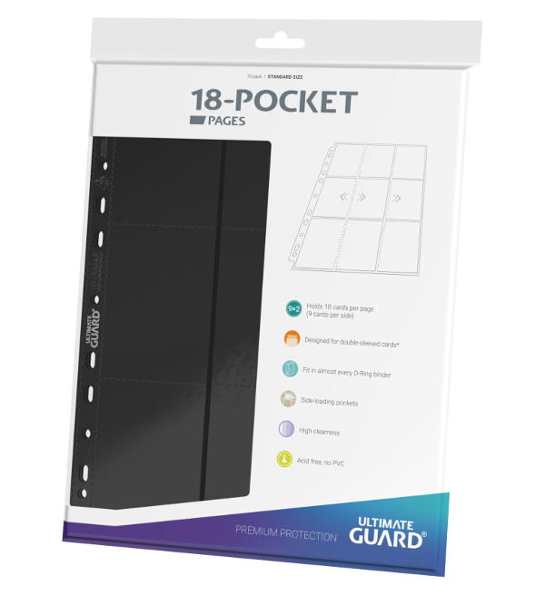 Pages de reliure double face de haute qualité (18 pochettes, 9 pochettes à l'avant et à l'arrière), adaptées à presque tous les classeurs à anneaux grâce à 11 trous avec une bande de trous à double renfort. Chaque pack contient 10 pages pour le transport et la conservation d'un total d'au moins 180 cartes (18 par page) dans deux pochettes (double pochette).