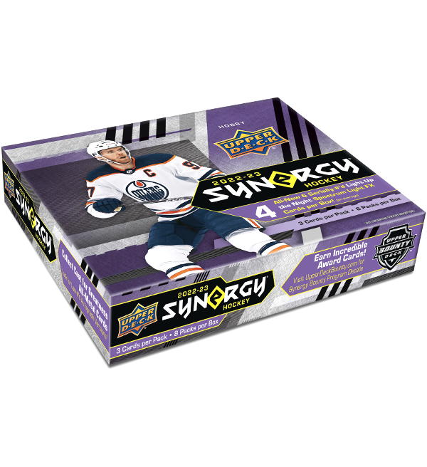 Hobby Box de 8 pochettes de la collection "Upper Deck NHL 2022-23 Hockey - Synergy" Trading Cards. Chaque pochette contient 3 cartes, cela fait un total de 24 cartes.